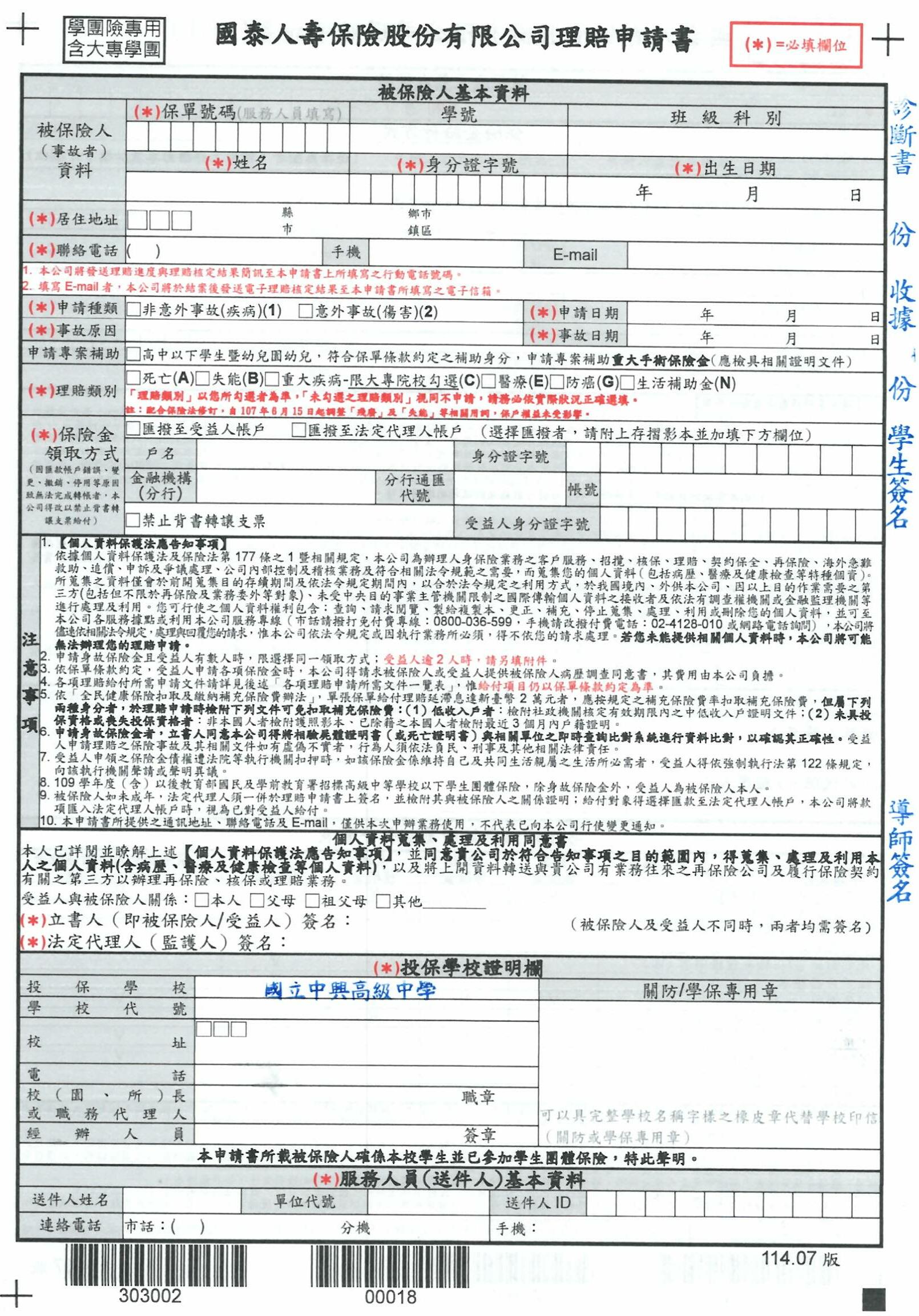 健康中心 / 學生團體保險 / 11407版空白理賠申請書